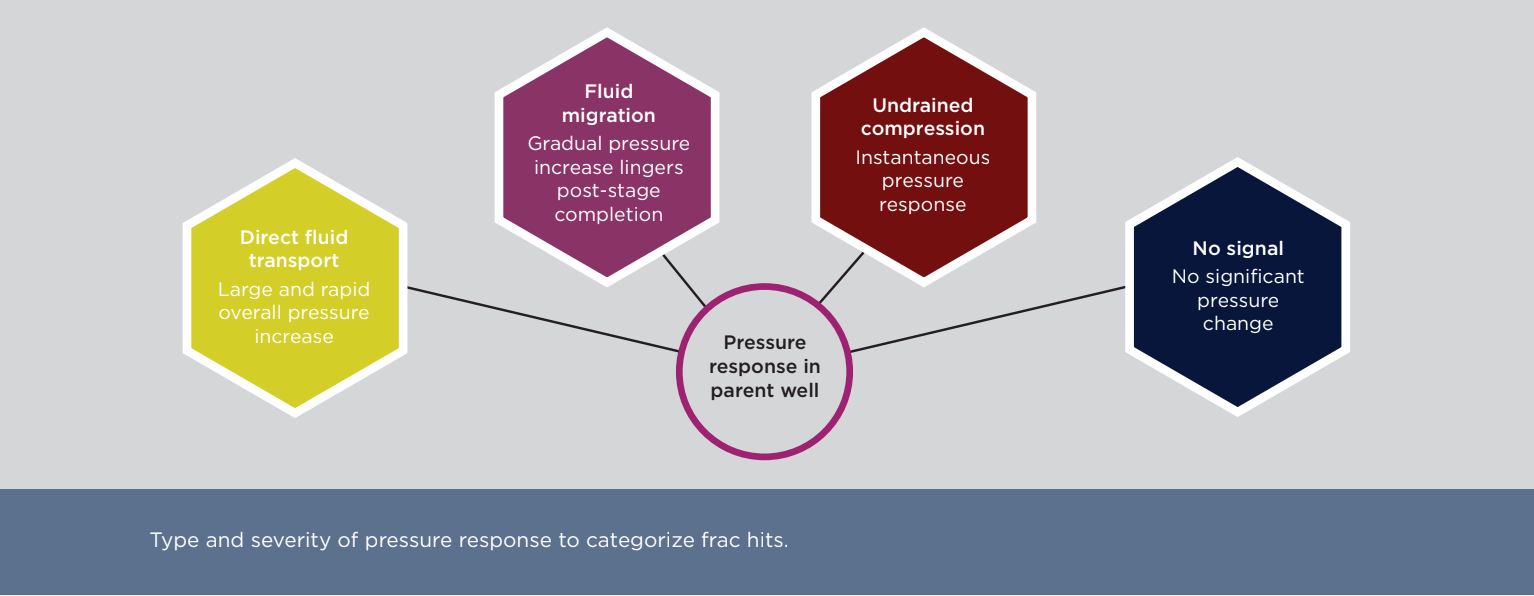 Looking at the timing of the pressure response, the compression forces can be felt instantaneously over hundreds of feet while the pressure increase can take minutes to hours because of fluid migration. A team of our geoscientists and completion engineers uses the timing and geomechanic principles to classify the observed pressure response into one of four categories: