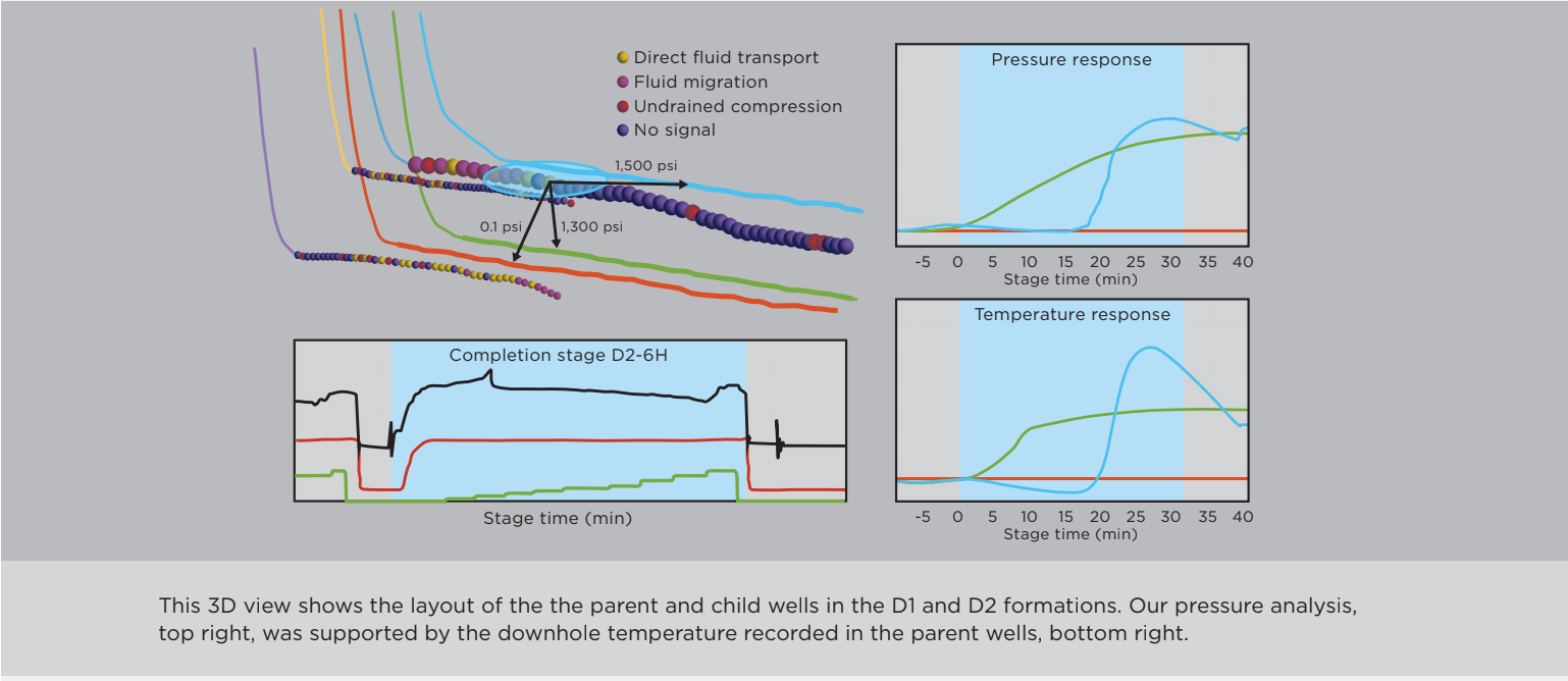 A Canadian operator working in the Montney, developing the D1 and D2 horizons shown in the 3D view, top left, was interested in learning how child well completions affect parent wells. We deployed our FracEYE service to quantify and categorize the induced pressure in the parent wells to find out.