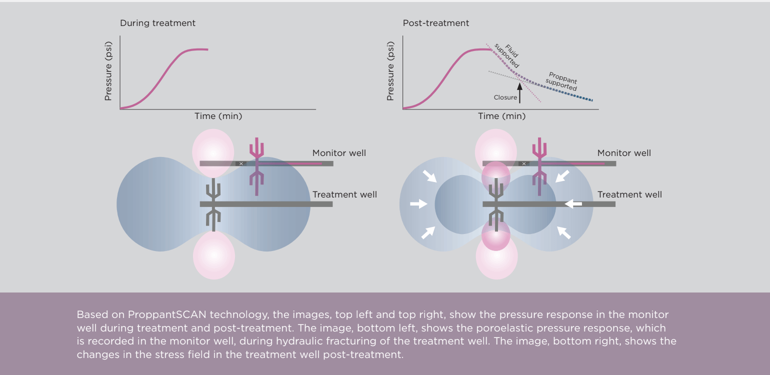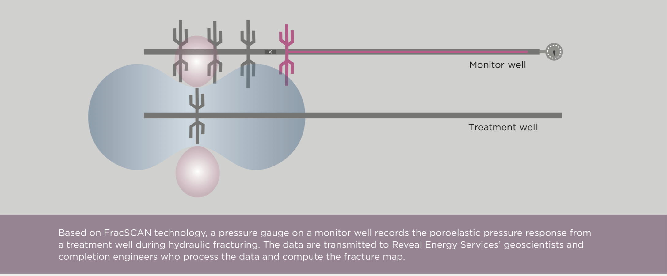 DiverterSCAN technology uses our pressure-based fracture map computed with our patented data acquisition1 and processing2. The data source is a surface pressure gauge on a monitor well—established through isolation from prior stages—that records the poroelastic pressure response from a nearby treatment well during hydraulic fracturing. As the treatment well is fracked, our geoscientists and completion engineers identify and quantify the poroelastic signals from the monitor well’s measured pressure response.